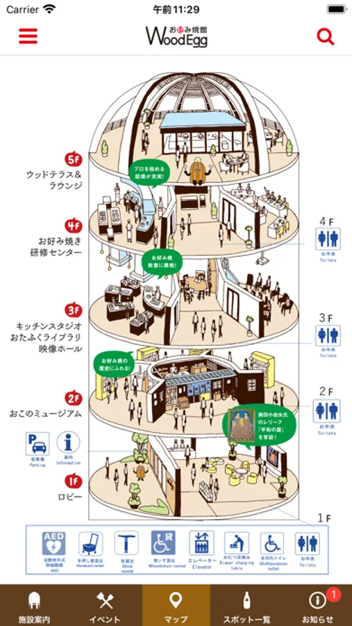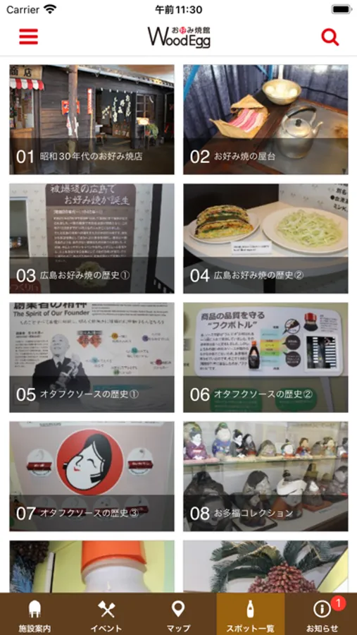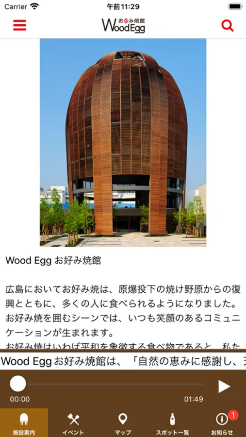 Wood Egg お好み館の展示、オタフクソース本社工場見学を、わかりやすく説明する音声ガイド用アプリです。お好み焼きの文化や歴史の展示をお楽しみください。