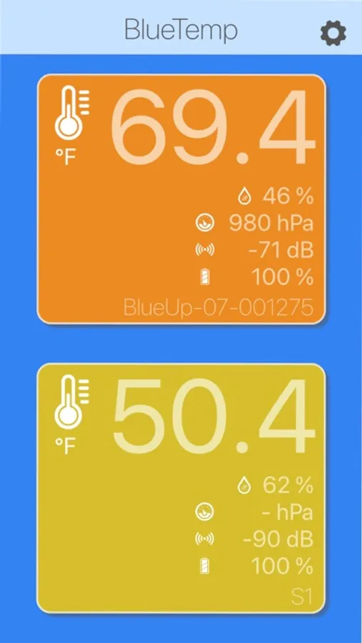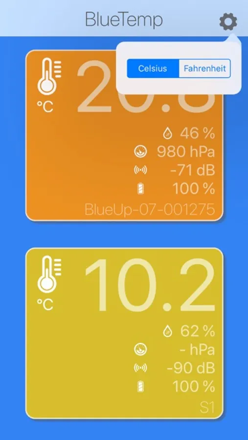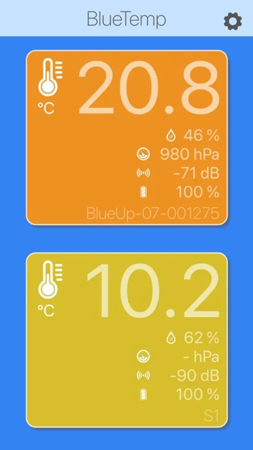 BlueTemp shows data for temperature, humidity and pressure, depending on what the sensor hardware supports.