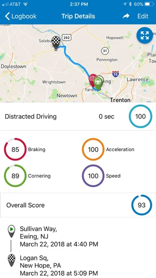 NJM SafeDrive runs in the background while you drive. It captures your driving behaviors and assigns scores for acceleration, speed, braking, cornering, and distracted driving (handling or interaction with the smartphone while the vehicle is in motion). The app provides an overall score for each trip, which is uploaded to your account. You don’t have to worry about using any data – the app allows you to upload your trip information only over a Wi-Fi connection. Users can review past trips in the app’s logbook to see how their driving scores have changed over time.