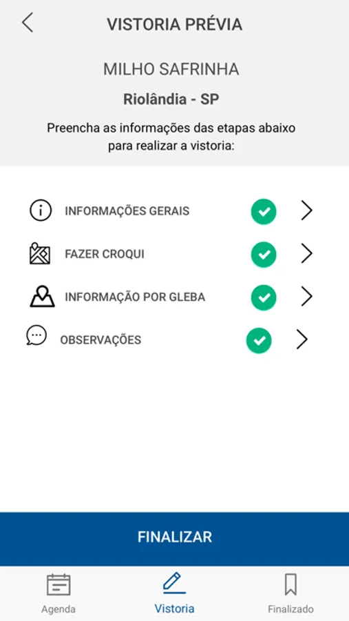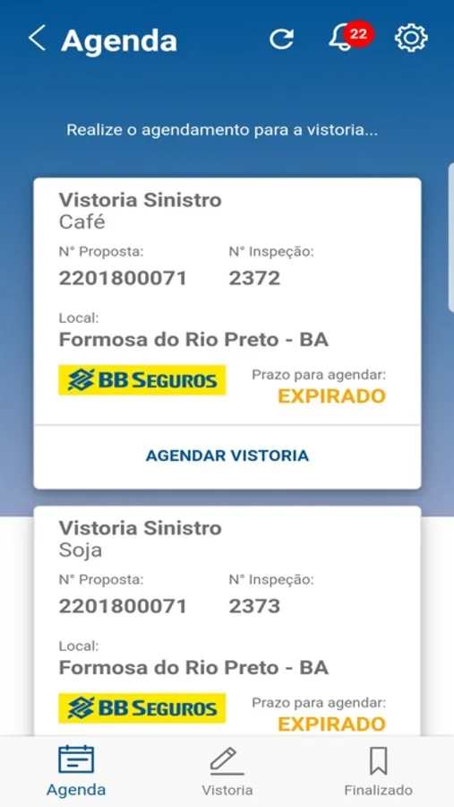 O Vistoria Agro é um aplicativo desenvolvido para que os inspetores representantes do GRUPO SEGURADOR BANCO DO BRASIL E MAPFRE possam realizar vistorias e enviar os laudos diretamente à seguradora. Através dele é possível preencher os laudos de vistoria, enviar áudios, fotos, vídeos e informações geográficas.