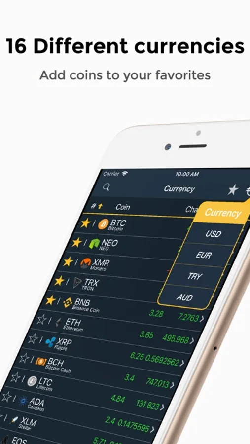 Bitcoin (BTC), Ethereum (ETH), Ripple (XRP), Bitcoin Cash (BCH), Litecoin (LTC), Cardano (ADA), NEO (NEO), Stellar (XLM), EOS (EOS), IOTA (MIOTA), Monero (XMR), Dash (DASH), NEM (XEM), Tether (USDT), TRON (TRX), VeChain (VEN), Ethereum Classic (ETC), Lisk (LSK), Qtum (QTUM), OmiseGO (OMG), Nano (NANO), Bitcoin Gold (BTG), Binance Coin (BNB), Zcash (ZEC), ICON (ICX), DigixDAO (DGD), Populous (PPT), Steem (STEEM), Waves (WAVES), Bytecoin (BCN), Stratis (STRAT), Verge (XVG), Maker (MKR), RChain (RHOC), Status (SNT), Dogecoin (DOGE), Siacoin (SC), Decred (DCR), BitShares (BTS), Augur (REP), Aeternity (AE), Bytom (BTM), Ontology (ONT), Waltonchain (WTC), Komodo (KMD), Aion (AION), Ardor (ARDR), Zilliqa (ZIL), Cryptonex (CNX), Ark (ARK)