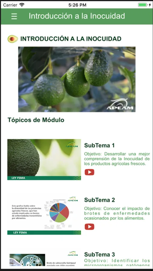 Esta aplicación fue diseñada con la finalidad de proporcionar una base de conocimientos prácticos y sencillos sobre la norma de Inocuidad de los productos agrícolas frescos de la Ley de Modernización en inocuidad de los alimentos FSMA, basado en el curriculum estandarizado del Produce Safety Alliance “Curso de capacitación para Productores”.