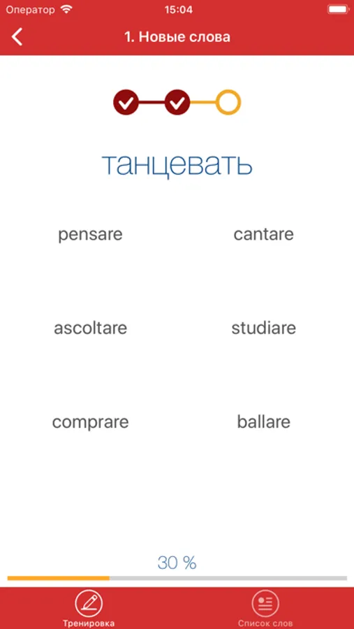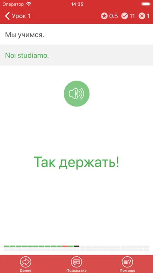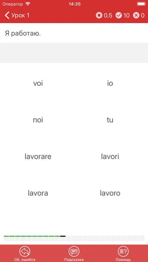 Из слов на экране вам нужно составить перевод на итальянском языке.