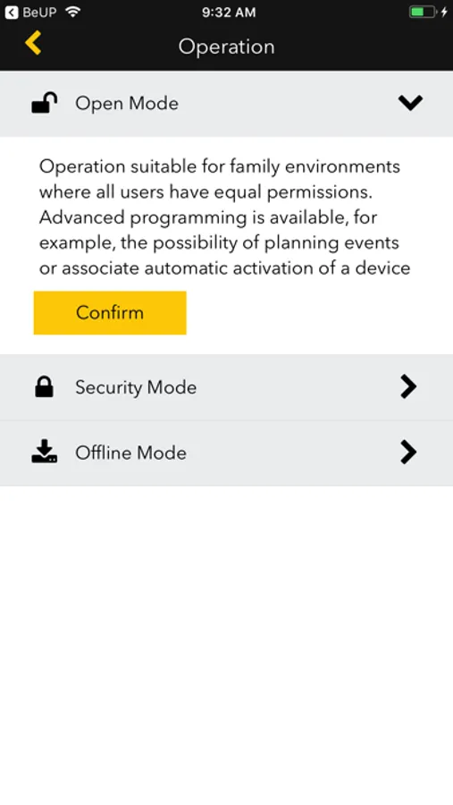 OPEN MODE, without any restrictions; SECURITY MODE, the Master user can manage and set restrictions for the Slave users; OFFLINE MODE, to be used in case there is no internet connection.