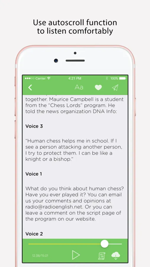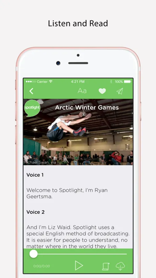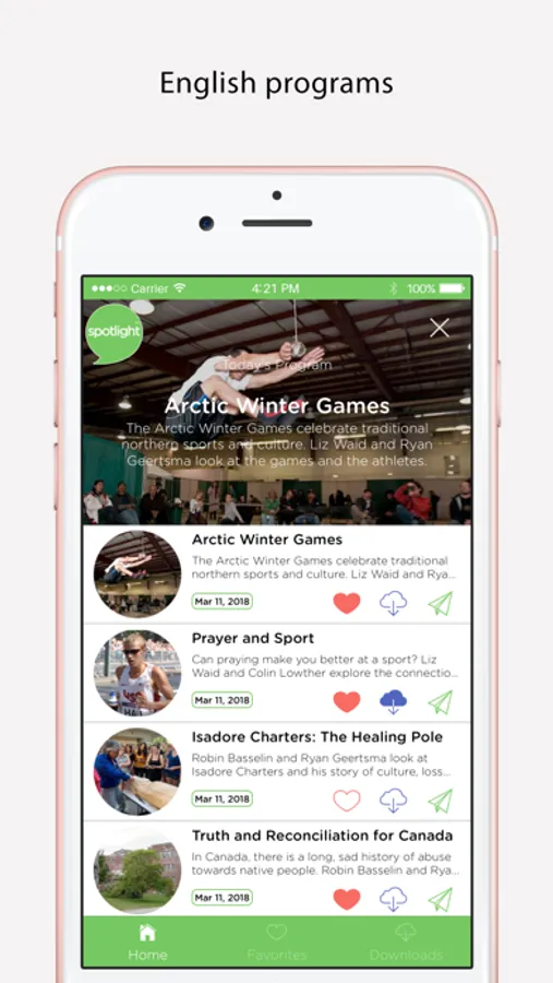 The Spotlight English app offers 5 programmes every week. You can listen to these programmes, and read along with scripts. You can stream programmes, download, and share with friends. You can also make a list of your favourites.