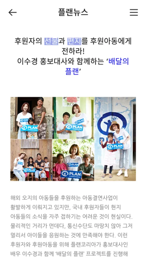 플랜코리아에서 진행하는 행사와 캠페인, 후원자 이벤트 등의 즐겁고 유익한 소식들을 푸쉬 알림 기능으로 실시간 확인할 수 있습니다.