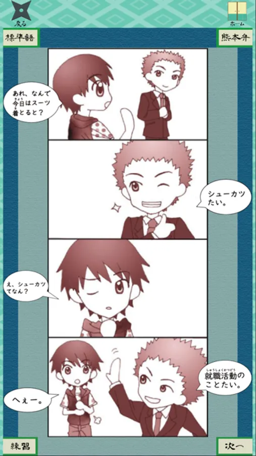 「標準語」を押すと4コマ漫画内の吹き出しが標準語表記に変わります。