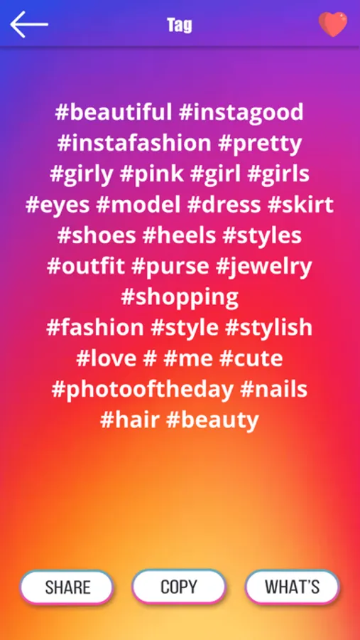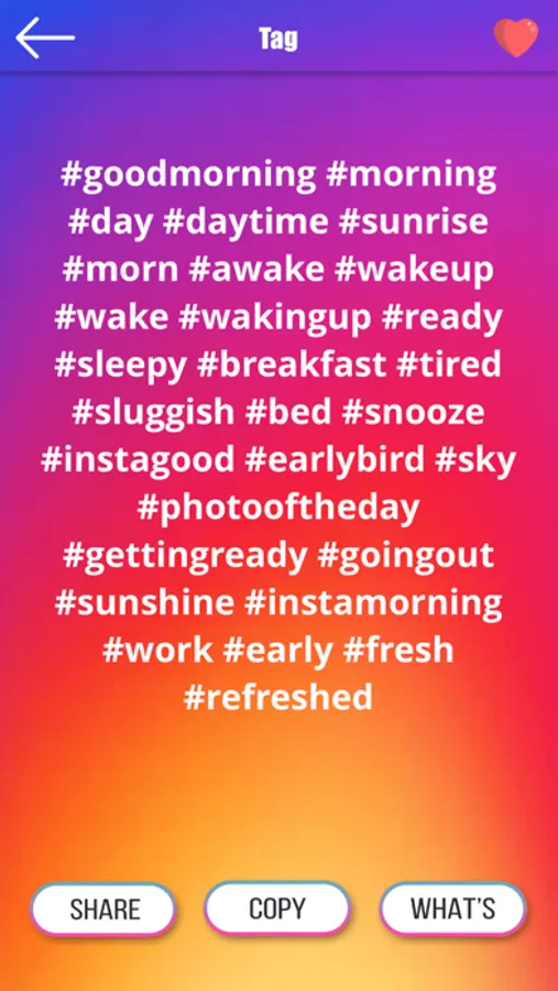 →> Simply choose a hash tag From list, tap "Copy" button (means copy and open that app) then open Instagram, Facebook or Twitter and paste on your pictures and posts! Also Directly Share on Whats by Tapping "Whats" Button.You can Share on other Apps By Tapping "Share" Button.