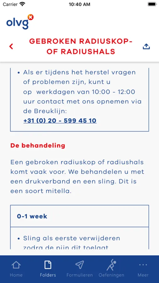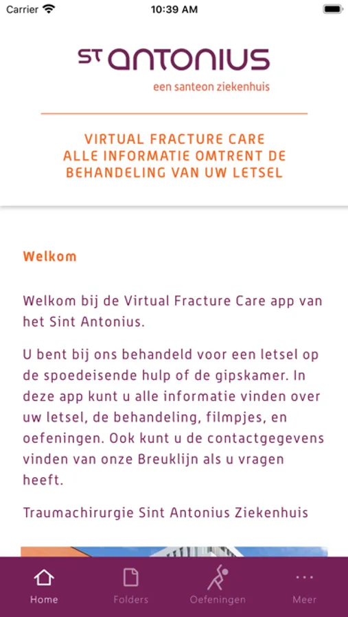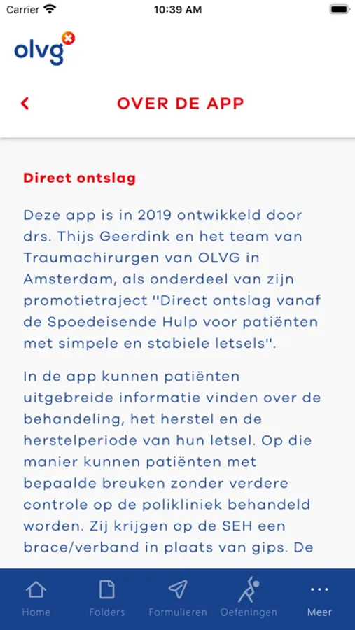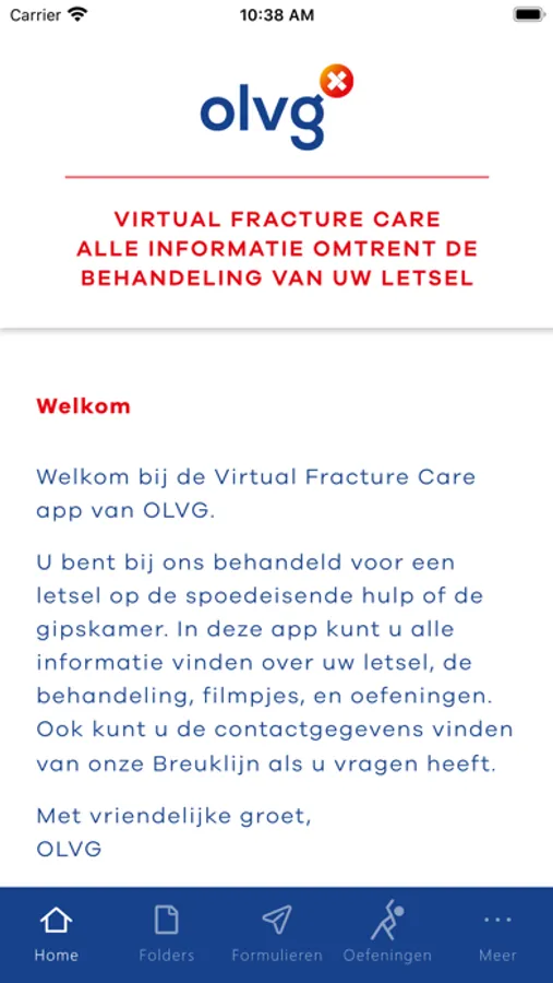 In de Virtual Fracture Care app (voorheen OLVG Trauma app) krijgt u direct antwoord op al uw vragen omtrent de behandeling van uw letsel. De gebruiker kiest bij welk ziekenhuis hij/zij patiënt is. De app toont dan de juiste gegevens voor het desbetreffende ziekenhuis. Wij hebben de visie dat patiënten overal in Nederland dezelfde behandeling en informatie zouden moeten krijgen. De inhoud van de app verbeteren we en breiden we samen uit. Zo proberen we te zorgen voor uniforme informatie van hoge kwaliteit voor alle patiënten met breuken. Alle ziekenhuizen in Nederland zijn welkom om zich aan te sluiten bij de app.