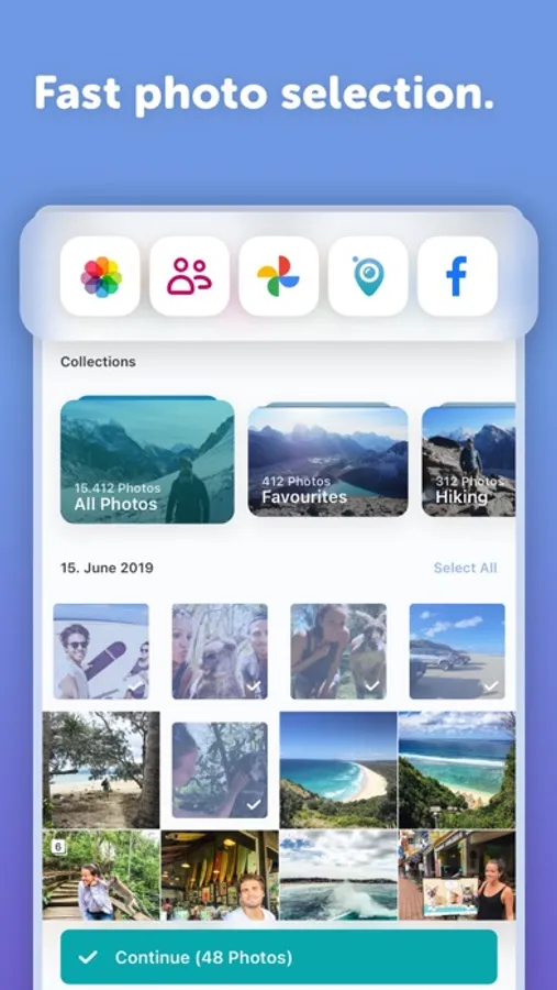 ▻ Choose your photo source: iPhone/iPad, iCloud, Google Photos, Facebook or Instagram