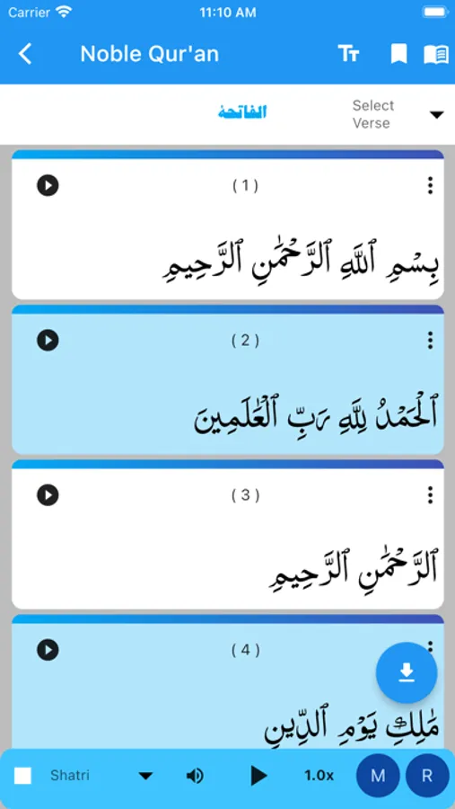 Customizable audio repeatable feature of each verse or group of verses – Excellent resource for memorization of Quran.