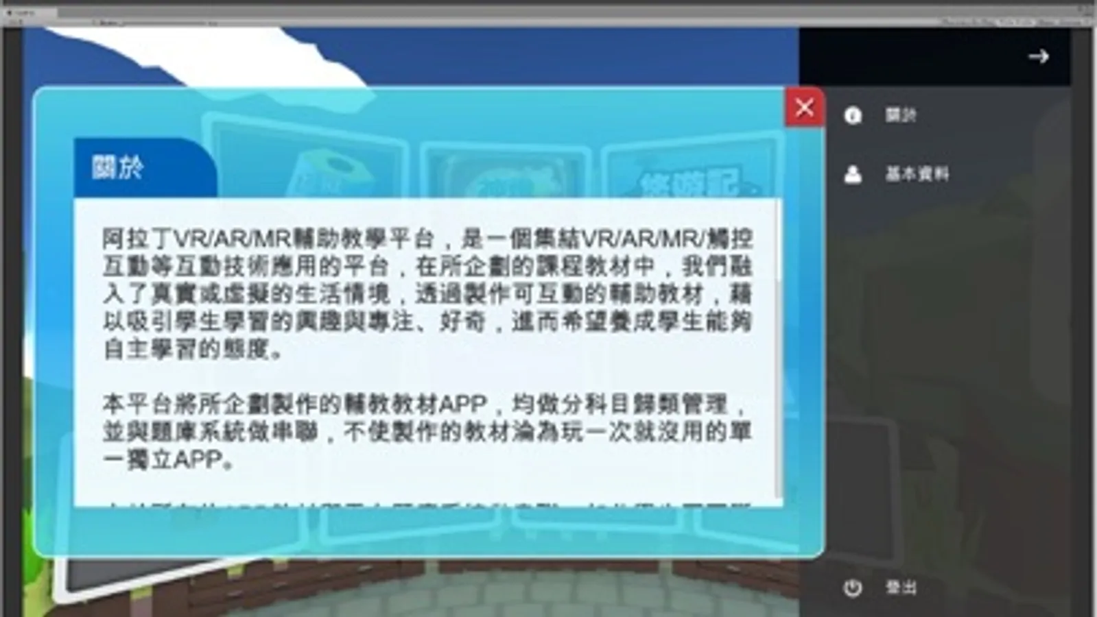 阿拉丁 VR/AR/MR輔助教學平台,是一個集結VR/AR/MR/觸控互動等互動技術應用的平台,在所企劃的課程教材中,我們融入了真實或虛擬的生活情境,透過製作可互動的輔助教材,藉以吸引學生學習的興趣與專注、好奇,進而希望養成學生能夠自主學習的態度。