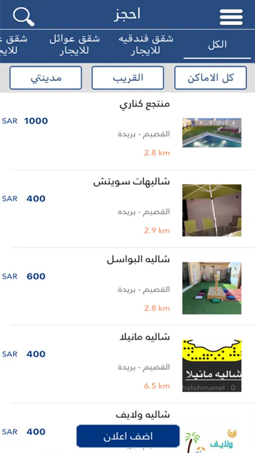 يمكنكم من خلال تطبيق احجز اضافة و حجز الشاليهات و الاستراحات و قصور الافراح و تأجيرالعقارات و المعدات و غيرها