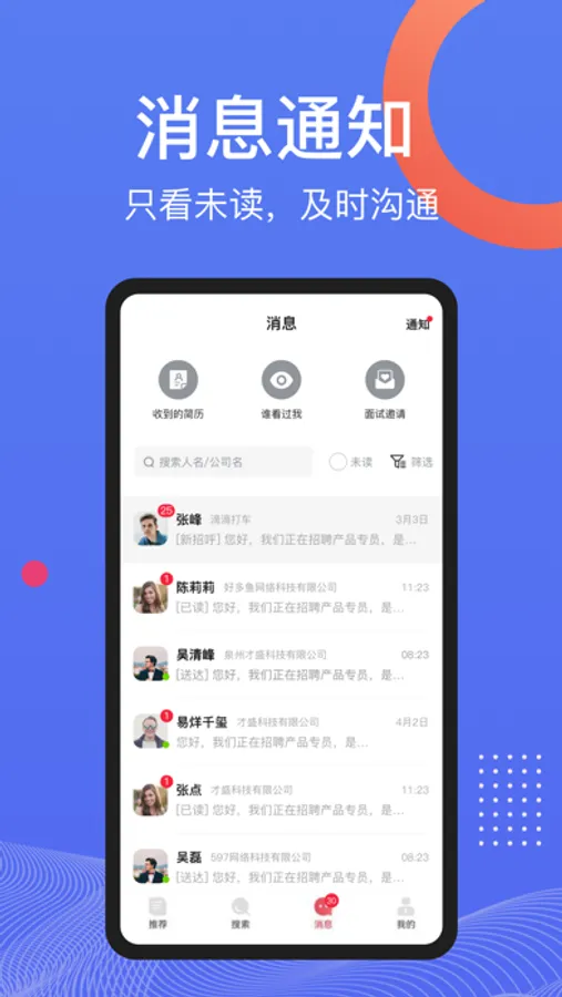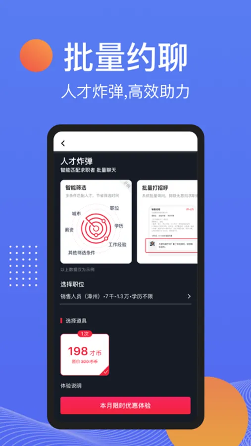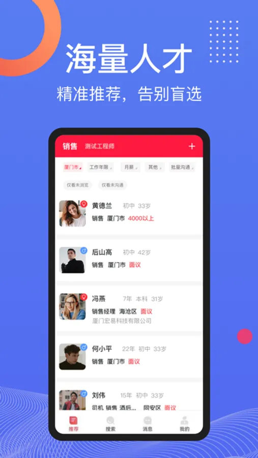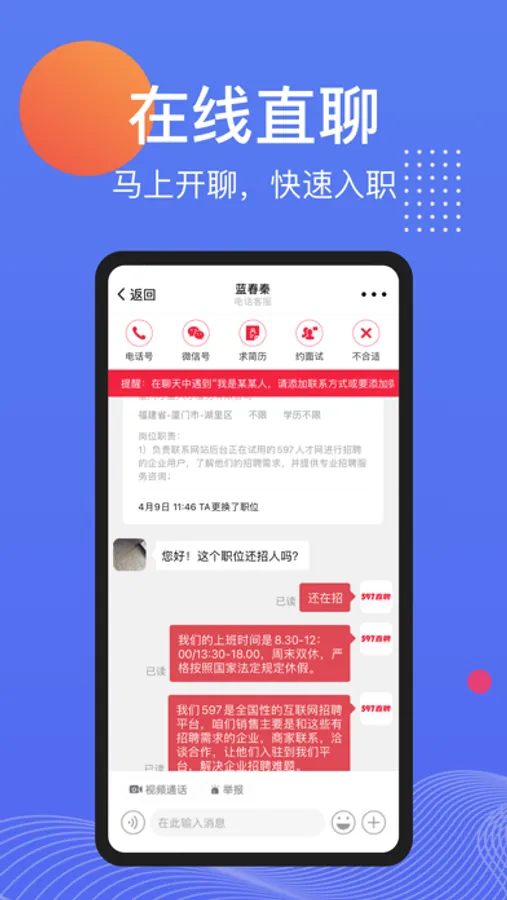 597企业版,由厦门才盛人才服务有限公司开发。为企业hr,用人部门提供的高效交流互动的手机招聘利器。通过597企业版,可以查看新投递的简历,邀约面试,与候选人即时沟通,更快的找到合适的人才。