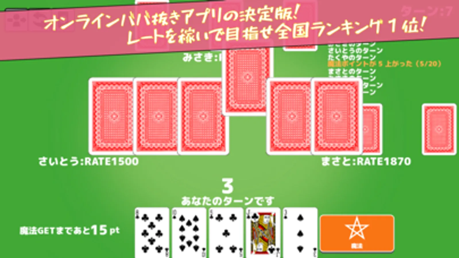 ネット対戦機能で全国のプレイヤーと対戦! ただ闇雲にプレイしてもうまく勝利できないババ抜きで、心理戦と魔法でどれだけ勝率を上げられるか、あなたの腕の見せ所!