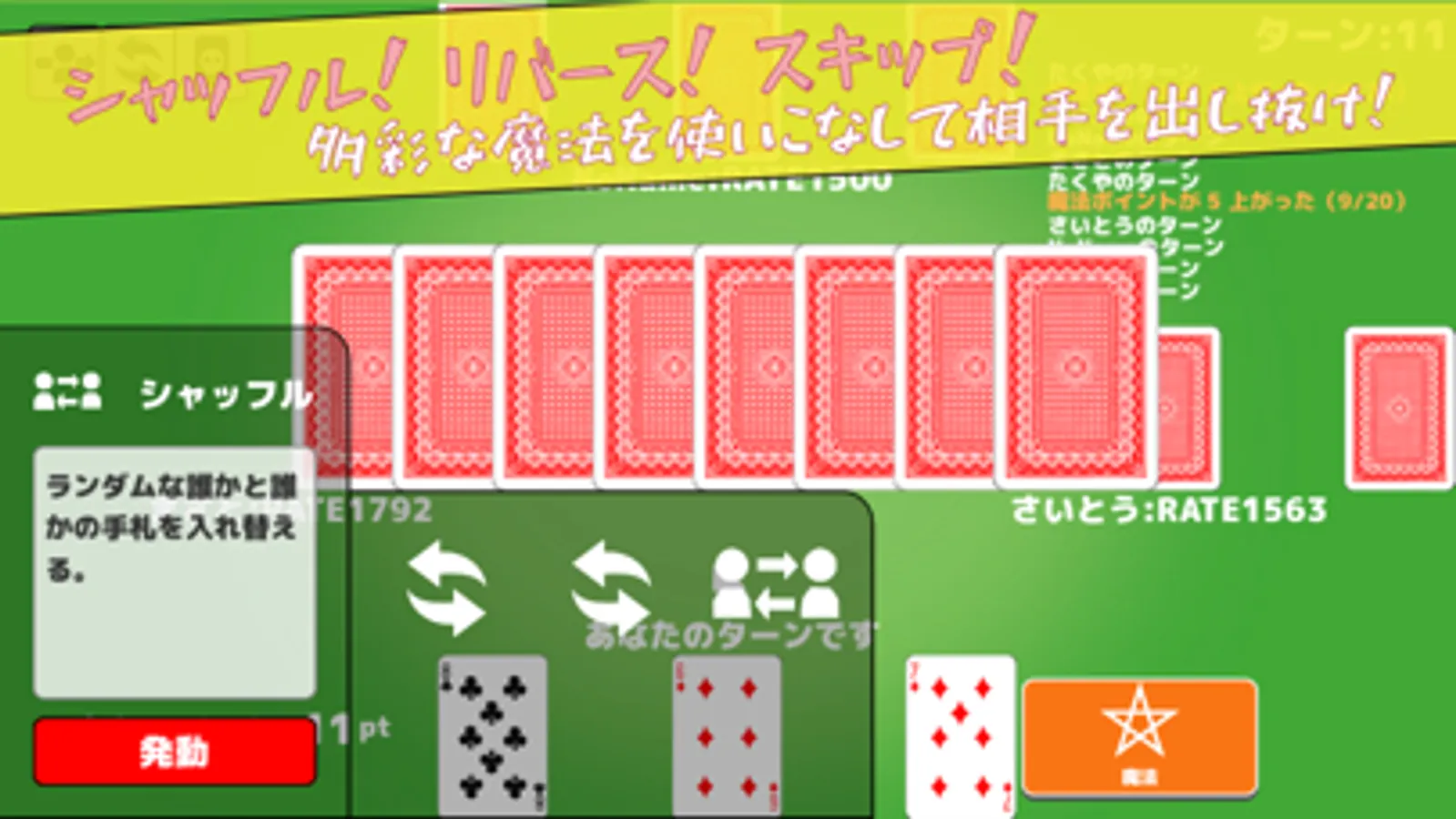 ゲーム中、引いた数字の合計が一定に達すると魔法を手に入れることができます。ゲームの順番を変える「スキップ」や「リバース」、ランダムに手札を入れ替える「シャッフル」をうまく使ってゲームを有利に進めよう!