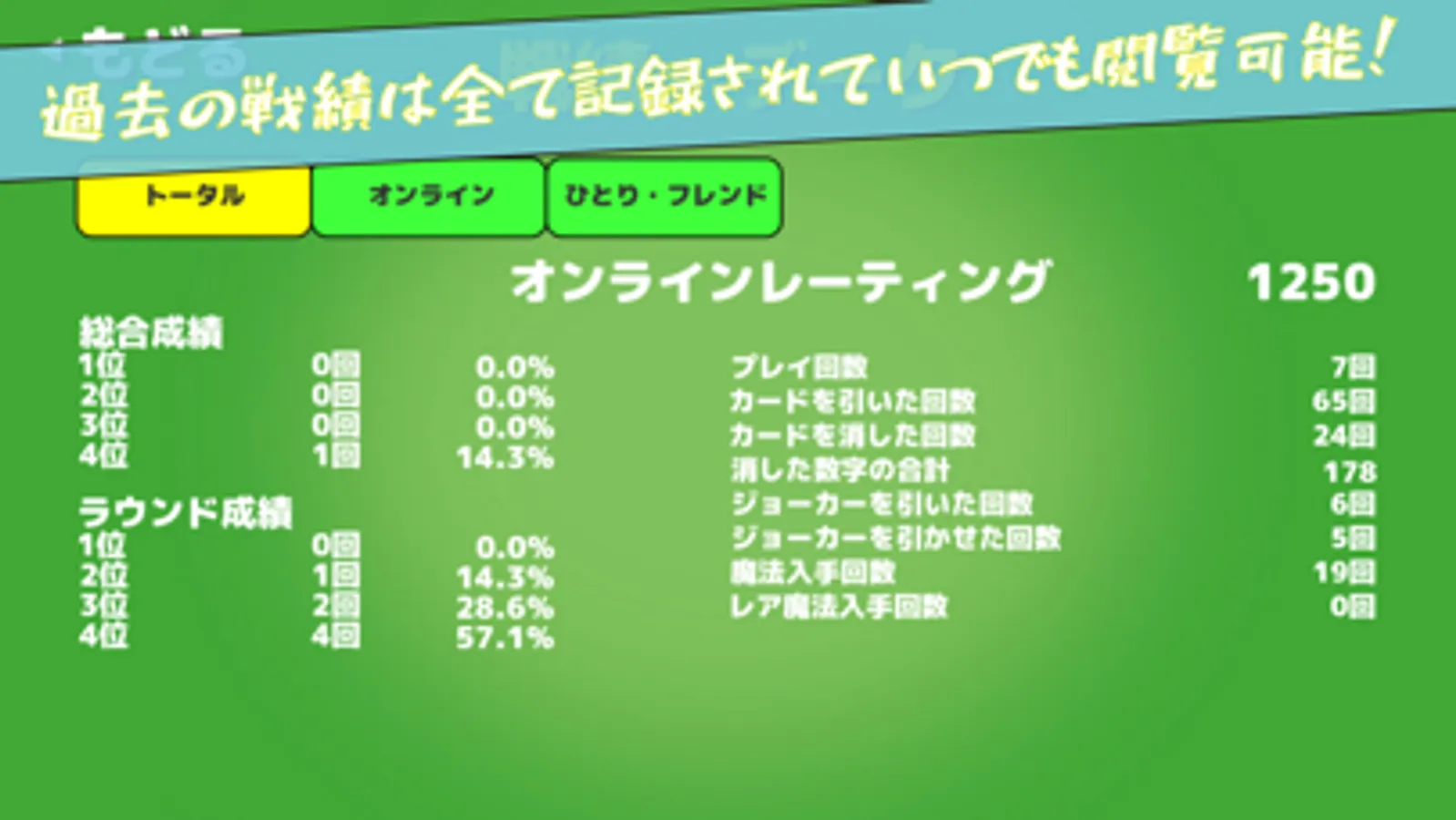 ・ネット対戦中は、アプリを閉じてしまった場合や通信が途切れてしまった場合は敗北として記録され、レートが下がってしまいます。ご注意ください。