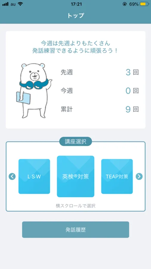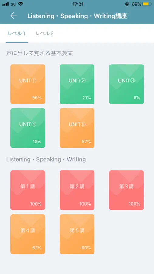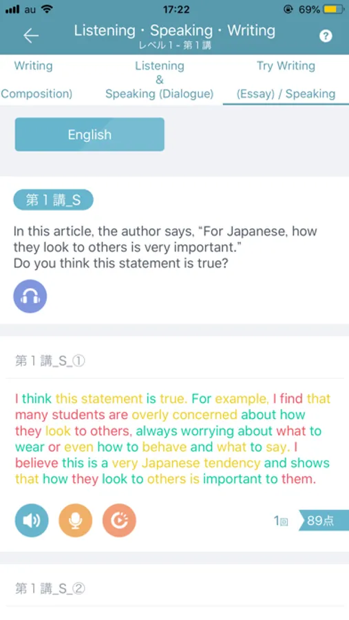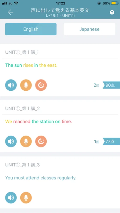 1.単元別英文法・語法講座と連動した「声に出して覚える基本英文」でライティングやスピーキングで使える重要英文を発話します。AIに英語の音声情報を学習させた、世界No.1の音声解析エンジンによる判定が出ますので、高得点が取れるまで何度も練習してください。
