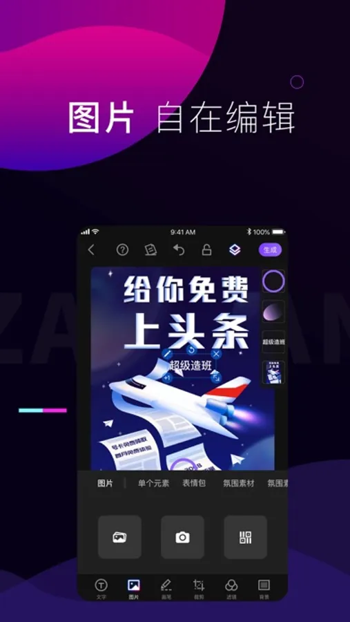 造班旨在建设数字视觉艺术分享、保护平台,设计师可以在平台上分享自己的作品,普通用户能够根据自己喜好进行的简单的图像处理,是一个简易的图片制作软件。
