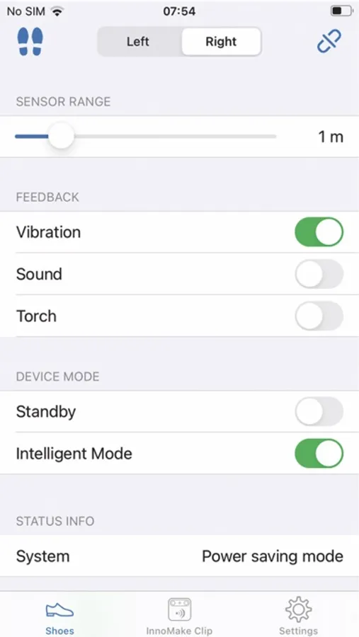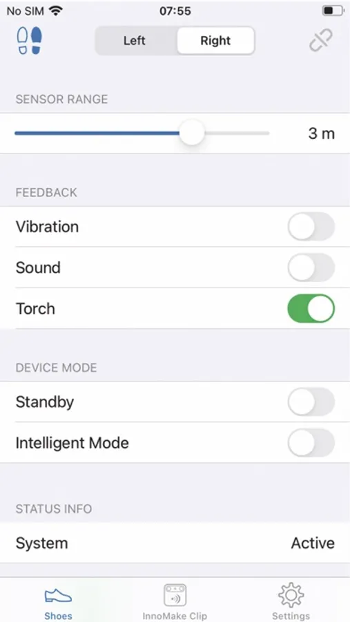 When obstacles are detected, the warning system provides pre-selected feedback. This feedback can be haptic (vibration), acoustic or visual. The vibration feedback is provided directly in the shoe, which allows you to feel if there is an obstacle in front of you. The acoustic feedback is provided via a smartphone and if required via e.g. bone conduction headphones so as not to drown out environmental noises.