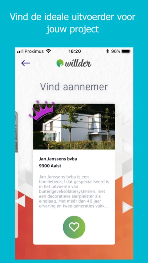 De app maakt een connectie tussen een bouwheer die een WILLCO Gevelsysteem wil laten plaatsen en een uitvoerder die daarvoor de beste partij is. De bouwheer kan een uitvoerder uitkiezen, de uitvoerder kiest op zijn beurt de werven waarvoor hij het meest geschikt is om de werken uit te voeren. Is er een match? Fantastisch, Willder brengt jullie samen!