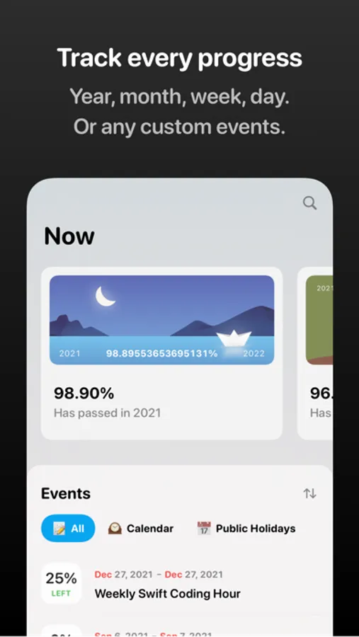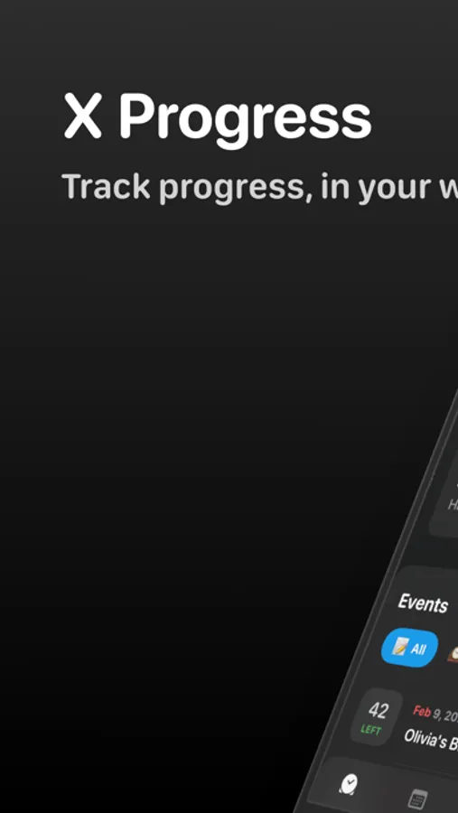 X Progress supports progress tracking from the year, month, week and day, to all kinds of custom events. And you can set notification alerts, write event related memo notes and use auto-repeat feature, to help you track events even better.