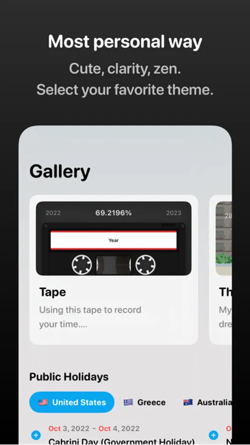 X Progress includes several delicate designed themes by different designers. Cute, clarity, or ZEN style, you can always find a theme that best expresses your feelings to show the progress.