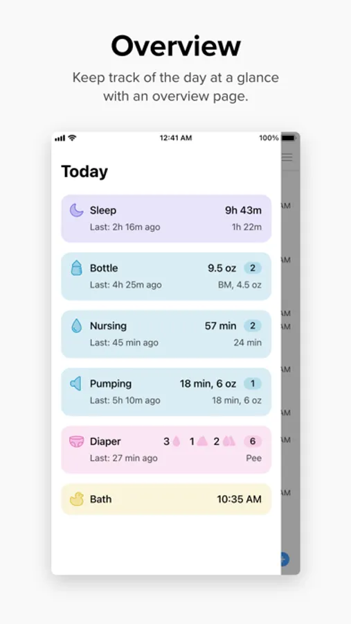 • Activity patterns: visualize the times of day when your child sleeps, feeds, and more