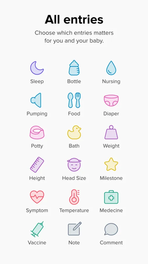 • Add your own milestones, health symptoms, medicines, and vaccines, alongside our presets