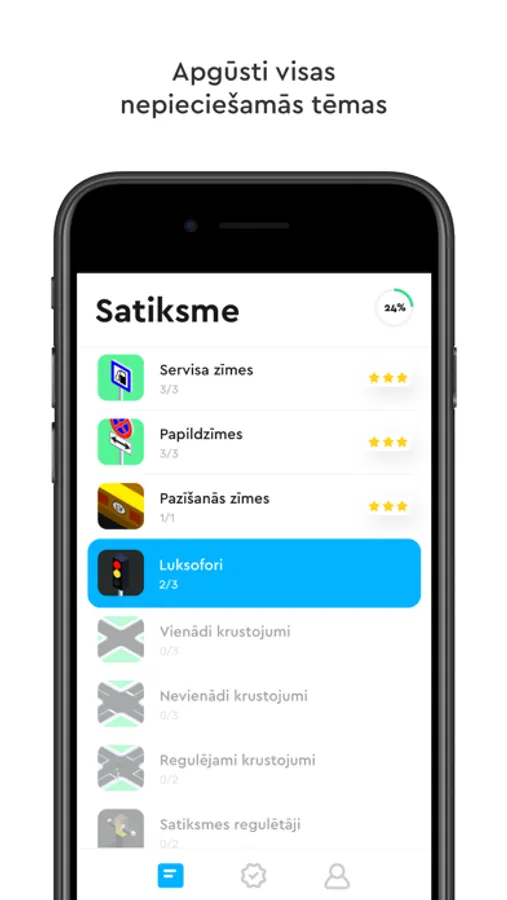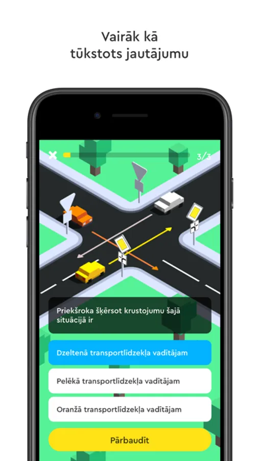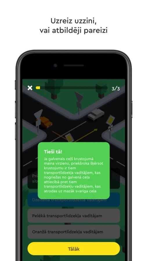 Yelo ļauj ātri, ērti un pēc būtības apgūt Latvijas ceļu satiksmes noteikumus un nepieciešamās tēmas, tostarp braukšanu krustojumos, tehnisko stāvokli, ārējās apgaismes ierīces u.c.