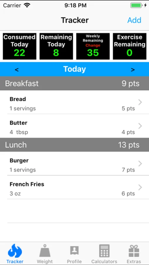 - Log your food items in a diary (your logged items will create your own database, no existing database is included ), track it and see how much more you can consume for the rest of the day and week