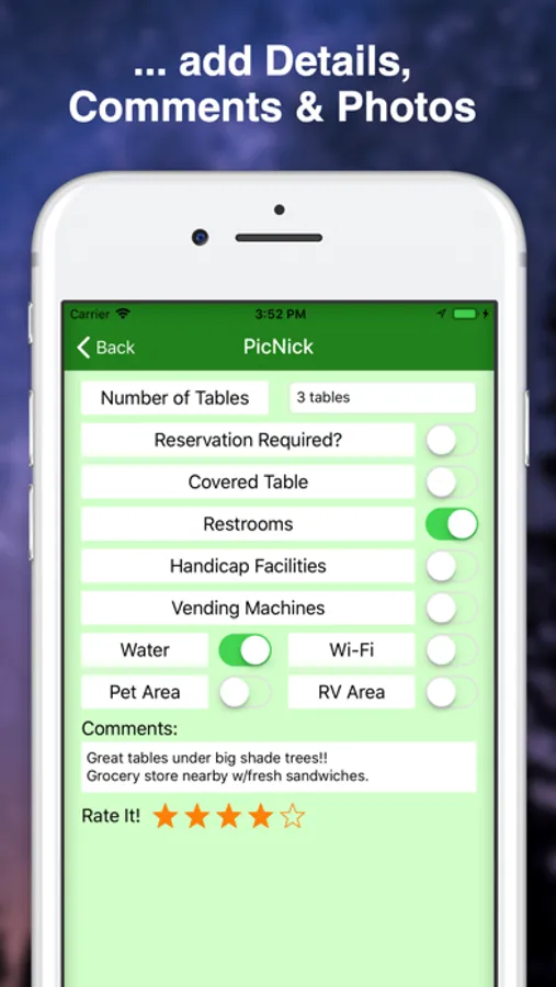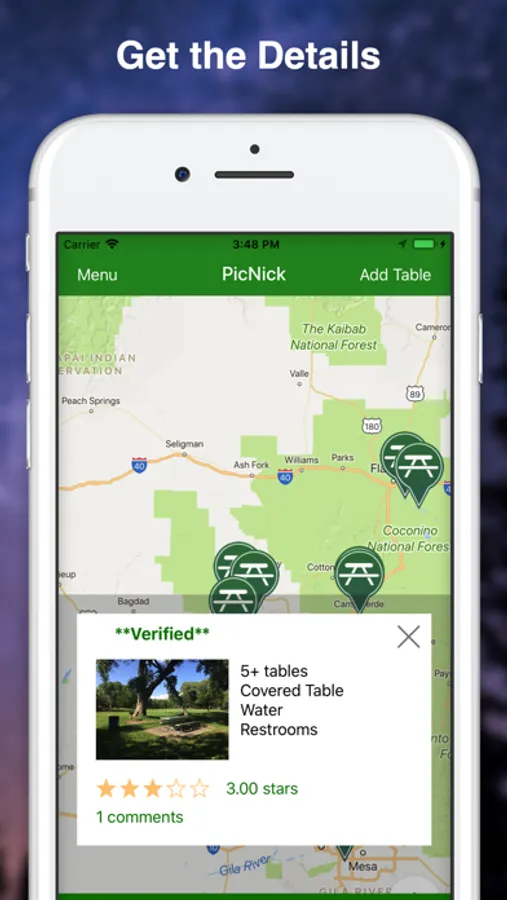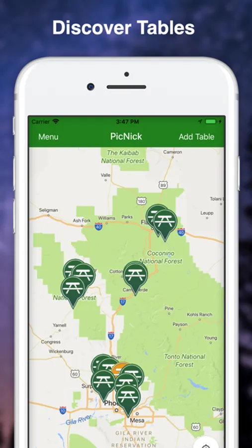 Open the PicNick app and find picnic tables near you. Zoom out and discover tables around the world. If you're traveling, find tables along the way. Maybe that perfect lunch spot under that big shade tree!