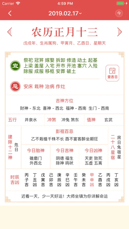 2、实用助手:每日运势、吉日查询、求签断事、心理测试等,完美结合传统文化与现代生活。