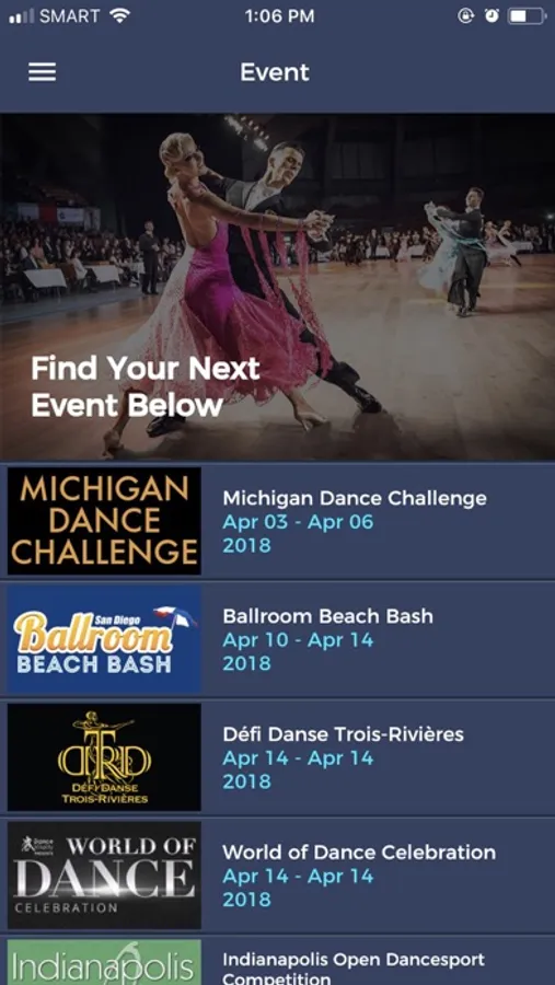 While travelling, at work, at home, or in the dance studio, use BallroomGO to review all the competition options at a glance on your mobile phone. No longer are you required to use one of those big desktop computers to get the information you need. Do it when and where you want to do it.