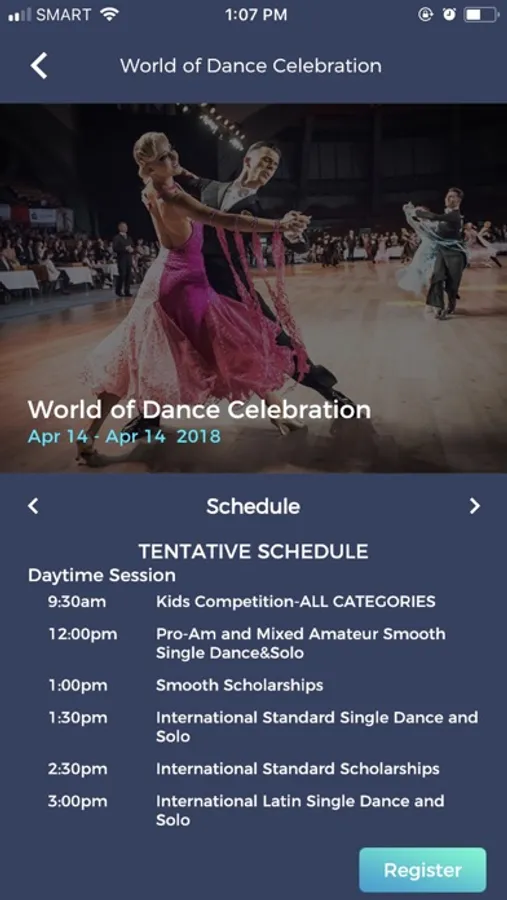 • YOUR PERSONAL PROFILE: Set this up once, and only once when you first use BallroomGO. It knows your important information required for registering at competitions; no longer do you have to enter the same information multiple times for the same event, or for different events.