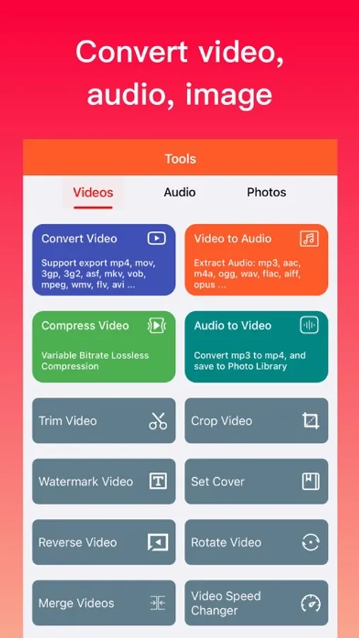 - Support converting video formats: MP4, 3GP, MOV, AVI, 3G2, ASF, MKV, VOB, MPEG, WMV, FLV, OGV, WEBM, MPG, etc.