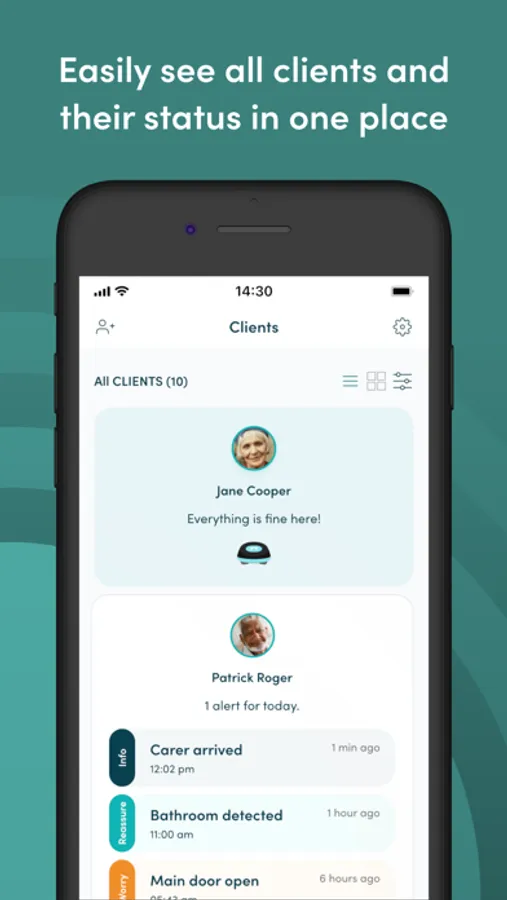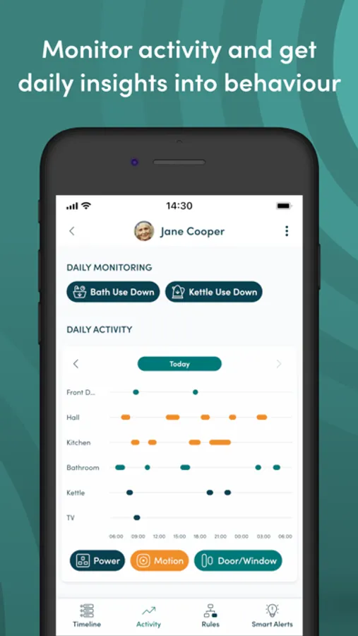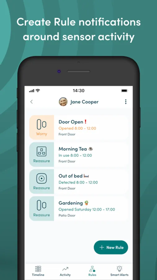 Customise your notifications using 'Rules' that specify what, when and how to be notified. Letting you know Mum is going about her normal routine. Multiple 'rules' can be created for each sensor device and can either indicate a reassuring or worrying behaviour. These unobtrusive notifications help you to react immediately to worrying behaviour, such as the front door being opened at night.
