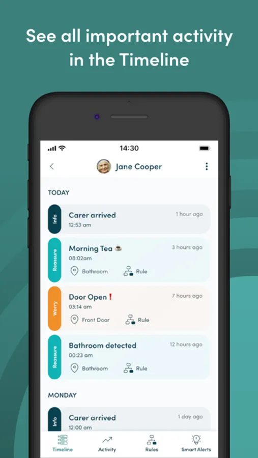 Use the 'Timeline' to monitor the things you care about, such as when Mum's carer has checked-in using the Home Hub RFID scanner function. Any created 'Rules' will also show up here.