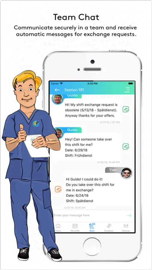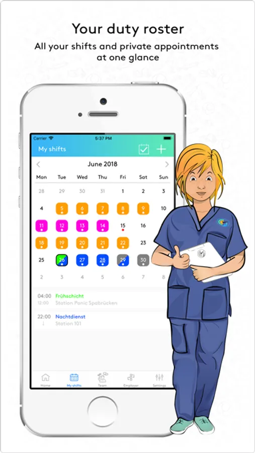 The app supports the self-organization of team members and reduces the effort for organizing in the team. There are numerous functions: Duty roster management and sharing, chatting, digital professional card, skill search, sick leave notifications, outage management, jumper pool management, working time recording and performance documentation, service exchange assistant, time corrections, break corrections, please do not disturb function and much more.