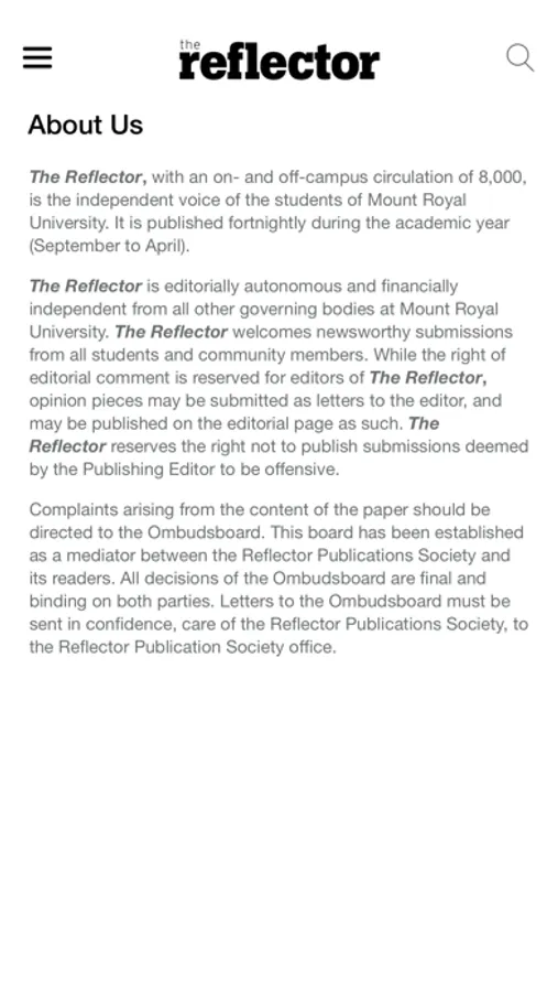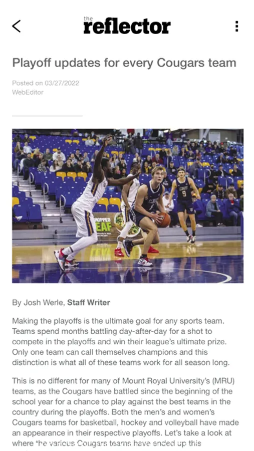 The Reflector Newspaper app is a digital aide for the students of Mount Royal University in Calgary, Canada. It includes all of the content of The Reflector newspaper, all important dates including academic deadlines and MRU Cougars games, and also a hyperlinked listing of many of the frequently called numbers at Mount Royal University. The app also has push notifications which, if enabled, will allow us to send important information about events and deadlines.