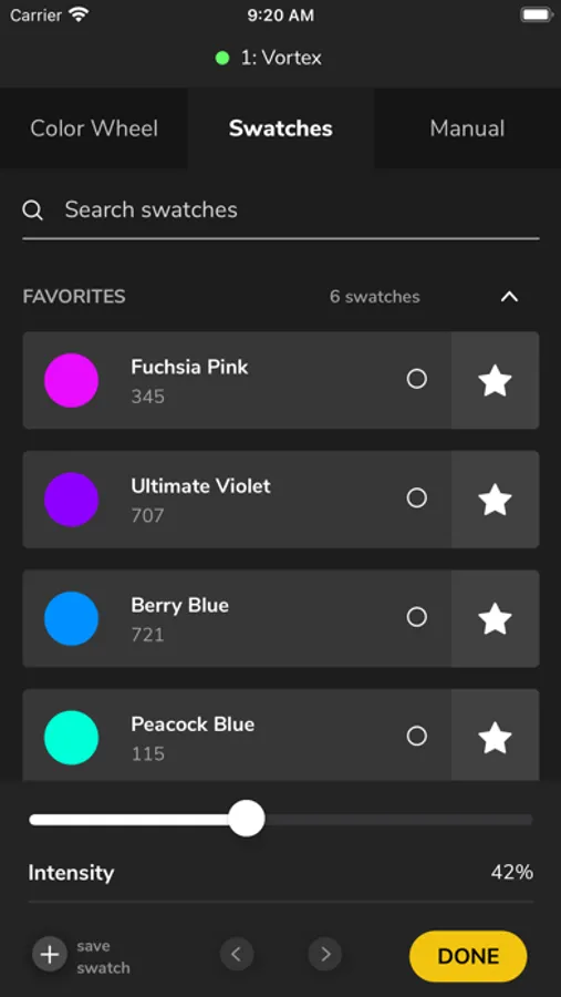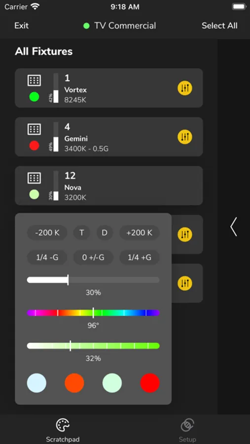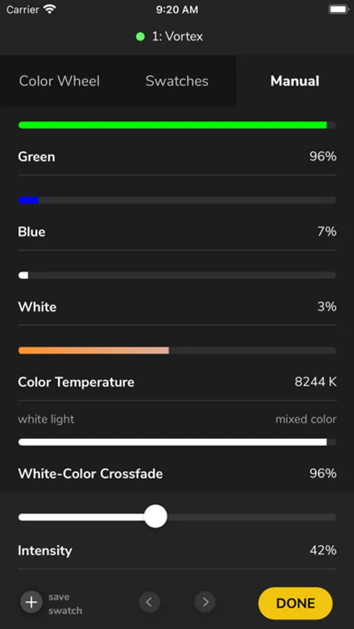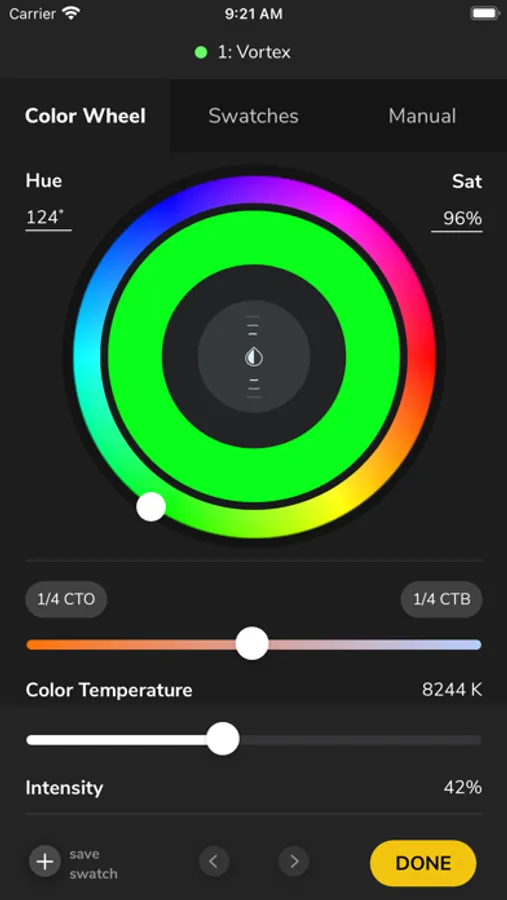 • Virtualization of color parameters available within the color wheel interface including color temperature, green/magenta tint, hue, saturation, and intensity making these parameters available to all light-modes that have color capabilities