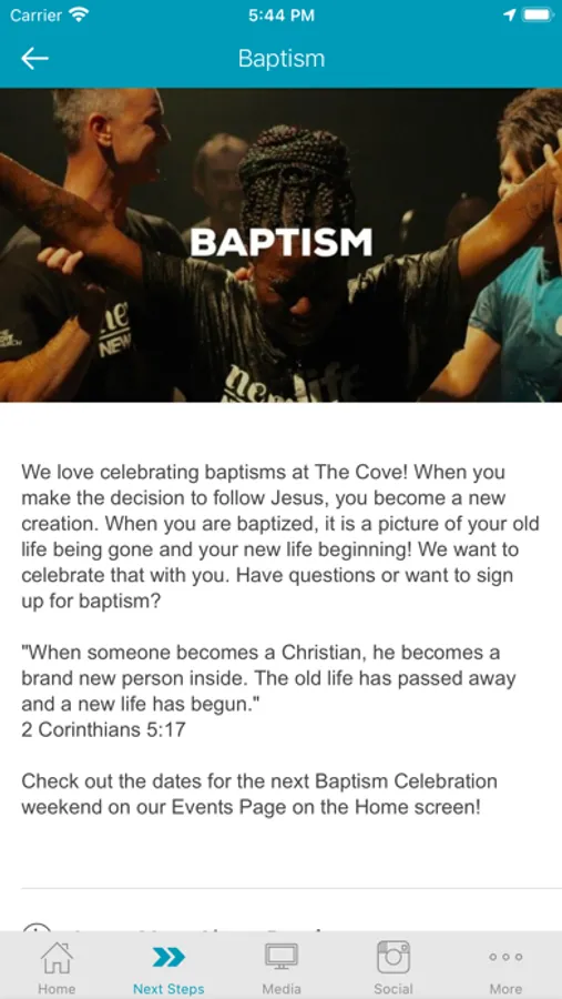 Take your next step by learning more about, and signing up for: Baptism, Life Groups, Serving and Prayer.