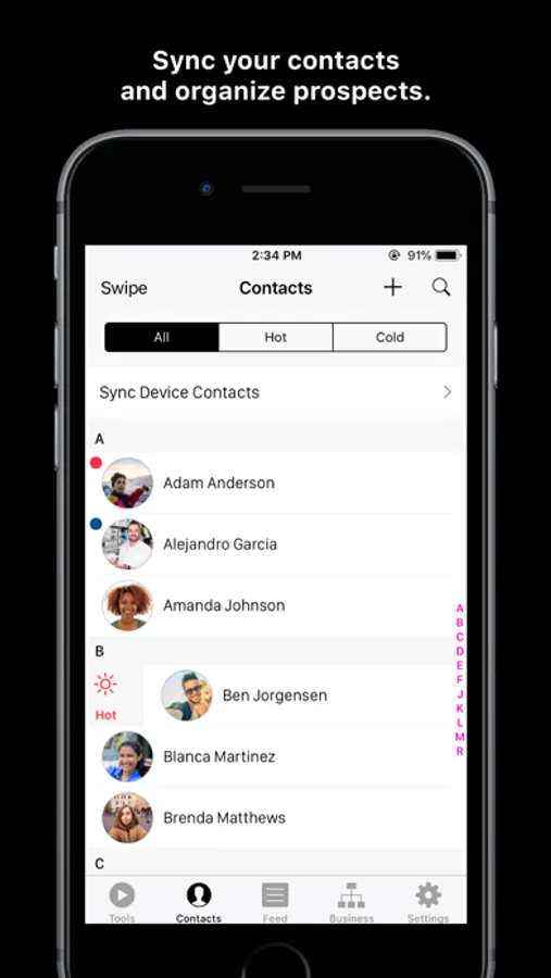 People: Manage contacts easily and swipe to sort them by interest level. You can make connections, add notes, or check out the Contact Feed to see the tools you've shared and whether or not your contacts have actually viewed them.