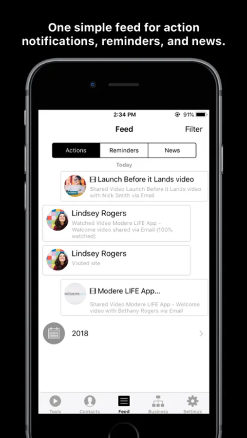 Feed: Keep track of everything you’ve shared and see what your contacts have viewed with notifications. You can even swipe notifications to mark them as a Reminder. News also brings all of the latest announcements and social posts from corporate straight to you--in one convenient place!