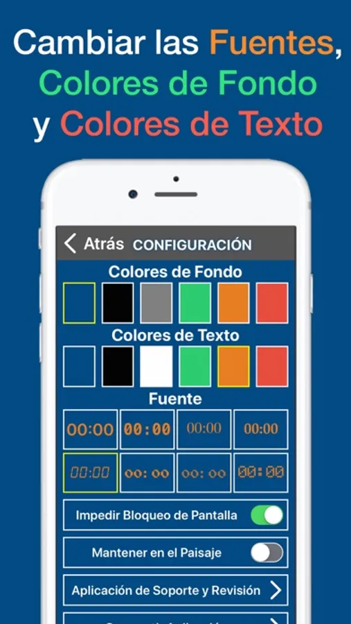 Pantalla totalmente personalizable con 6 colores de fondo, 6 colores de texto y 8 fuentes disponibles.