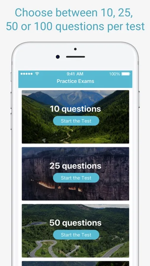 • Four practice modes – Choose between 10, 25, 50 or 100 questions (full exam) per test. In addition, a practice mode with only traffic sign and road marking questions