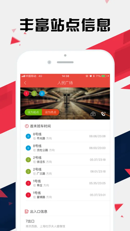 换乘指引、出口信息、地铁线路图、线路站点信息、首末车时间、车站周边地标地图等各类有价值的信息,助您全方位掌握地铁出行信息。