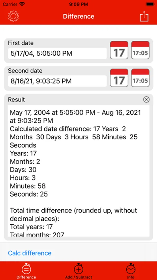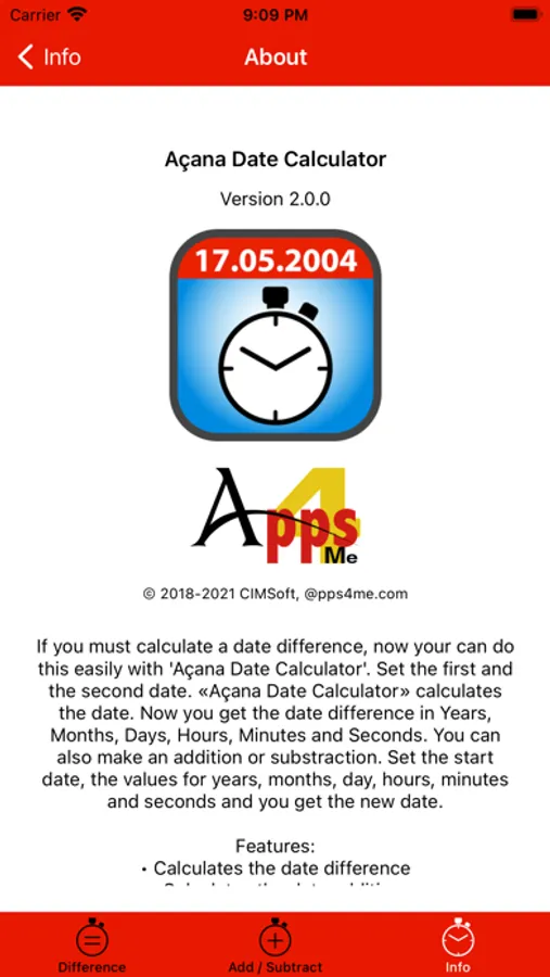 If you must calculate a date difference, now your can do this easily with 'Açana Date Calculator'. Set the first and the second date. «Açana Date Calculator» calculates the date. Now you get the date difference in Years, Months, Days, Hours, Minutes and Seconds. You can also make an addition or subtraction. Set the start date, the values for years, months, day, hours, minutes and seconds and you get the new date.