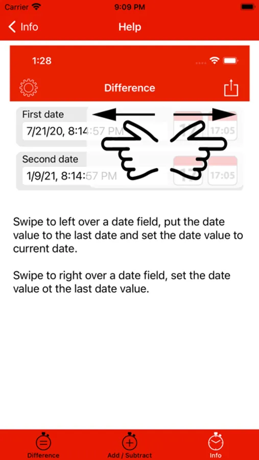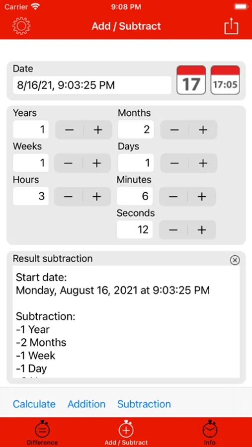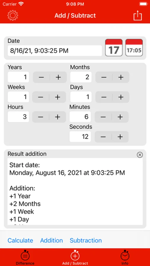 • Share the date difference, addition or substracton on mail, messages, twitter or Facebook, etc