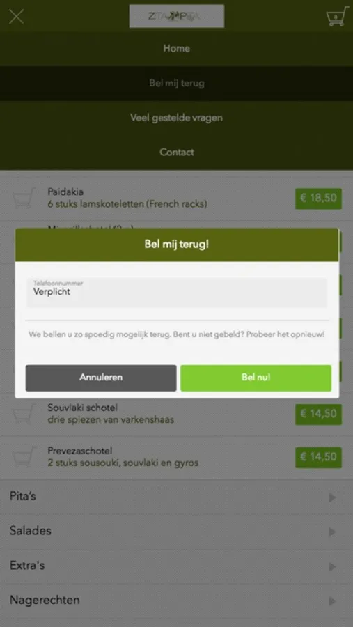 Heeft u een vraag en/of opmerking over een bepaald gerecht en wilt u teruggebeld worden door ons? Dit kunt u doen door op de ‘’Bel mij terug’’ knop te drukken en u wordt kosteloos door ons teruggebeld!